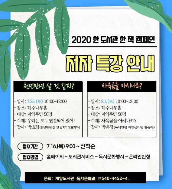 저자 특강은 계양도서관 홈페이지를 통해 신청할 수 있으며, 자세한 사항은 홈페이지 또는 독서문화과(☎540-4452~4)로 문의하면 된다.