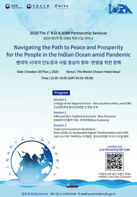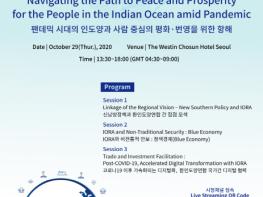 이번 세미나는 “팬데믹 시대의 인도양과 사람 중심의 평화·번영을 위한 항해(Navigating the Path to Peace and Prosperity for the People in the Indian Ocean amid Pandemic)”를 주제로, 우리 신남방정책과 IORA 간 접점을 모색하는 한편, 청색 경제(Blue Economy)를 중심으로 한 비전통안보 및 코로나19 이후 주목되고 있는 디지털 무역·투자 협력 방안 등을 논의할 예정이다.