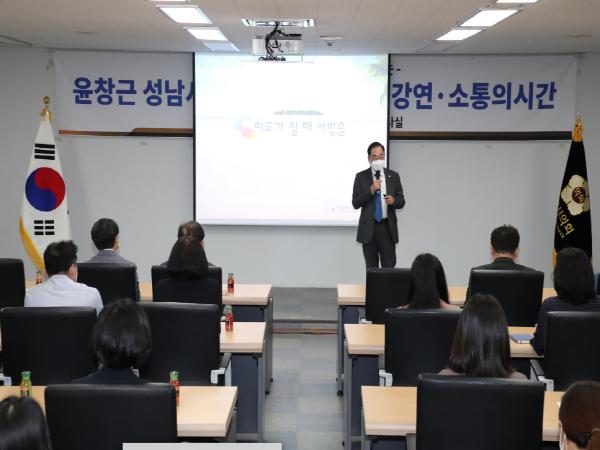 성남시의회 윤창근 의장은 22일 시의회 세미나실에서 의회사무국 직원을 대상으로 특강 및 소통의 시간을 가졌다.
