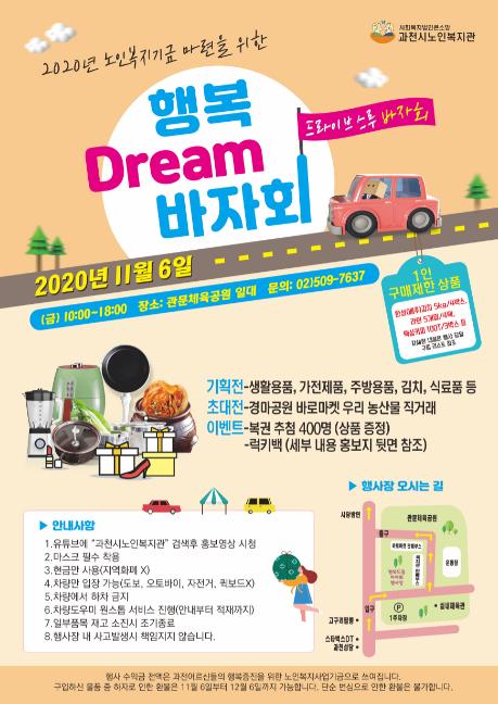 과천시노인복지관(관장 송석하)은 6일 오전 10시부터 관문체육공원에서 노인복지사업기금 마련을 위한 ‘드라이브스루 행복드림 바자회’를 개최한다. 행사는 오후 6시까지 진행될 예정이며, 제품 소진 시 조기마감된다.