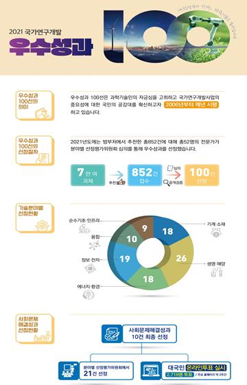 올해는 정부지원을 받아 수행한 범부처 약 7만 여 연구개발(R&D) 과제(‘20년 기준) 중, 각 부‧처‧청이 추천한 총 852건의 후보성과를 대상으로, 산‧학‧연 전문가들로 구성된 우수성과 선정평가위원회에서 질적 우수성을 평가한 후, 대국민 공개검증을 거쳐 최종 100건의 우수성과를 선정했다.