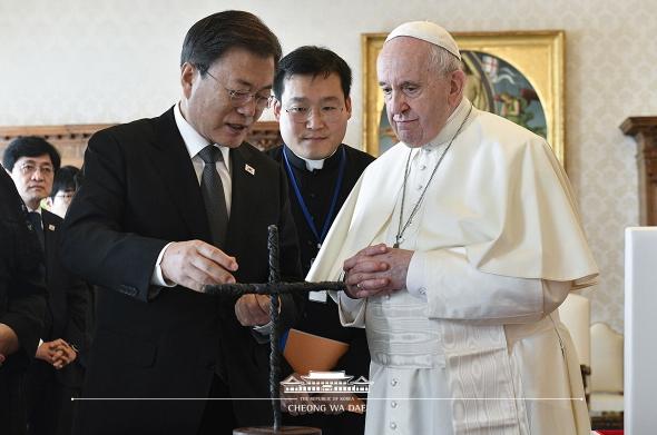 문 대통령은 “지난 방문 때 교황님께서 한반도 평화를 위한 미사를 집전해 주시고, 한반도 평화를 위한 대화 노력을 축복해 주셨다”며 감사의 뜻을 전했다.