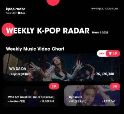 케플러의 ‘WA DA DA’ 뮤직비디오는 케이팝 레이더 2주차 집계 기간 (2022년 1월 2일 ~ 2022년 1월 8일) 동안 약 2,613만 뷰의 조회수를 발생시키며 1위를 차지, 뜨거운 인기를 자랑했다.