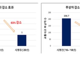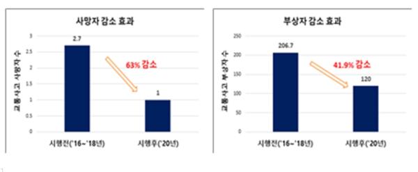 효과분석은 행정안전부와 한국교통연구원이 지난 2019년 사업을 완료한 전국 179개소를 대상으로 시행 전 3년 평균(’16~’18년)과 시행 후 1년간(’20년) 사고 현황을 비교한 결과이다.