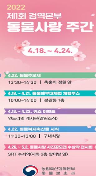 [중앙방송, 김영진 기자] 농림축산검역본부는 동물보호·복지에 대한 대국민 공감대 확산 및 성숙한 ‘동물사랑’ 문화 조성을 위하여 4월 18일부터 24일까지 ‘제1회 검역본부 동물사랑 주간’을 운영한다.