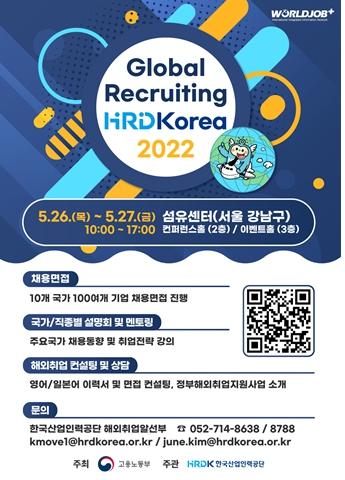 한국산업인력공단(이사장 어수봉)은 ‘2022 글로벌 리크루팅 박람회’(Global Recruiting HRDKorea 2022) 참가자를 9일부터 온라인으로 모집한다.