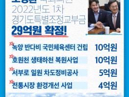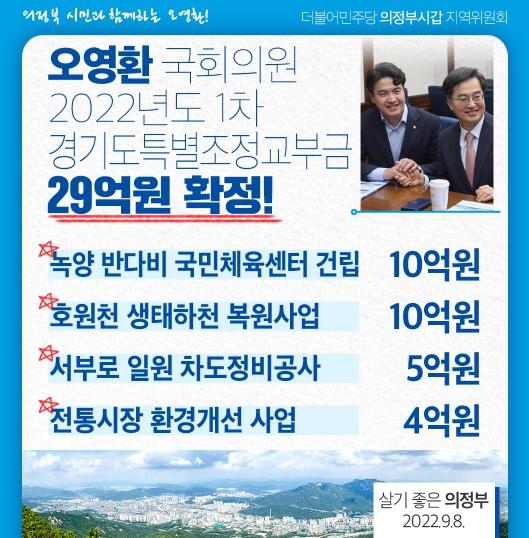 [중앙방송, 박노일기자] 오영환 국회의원(더불어민주당, 의정부시 갑)은 의정부시 갑 지역의 2022년도 1차 경기도 특별조정교부금 29억 원이 확정됐다고 8일 밝혔다.