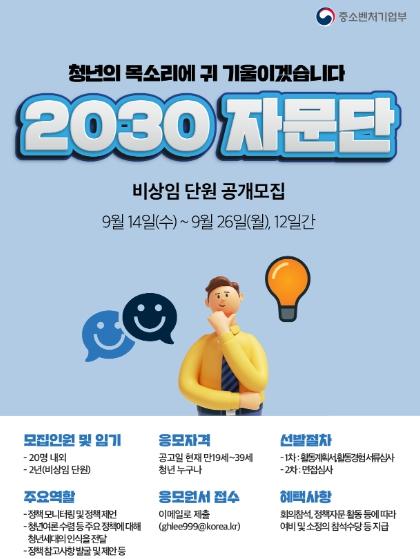 [중앙방송, 박정원기자] 중소벤처기업부는 청년세대와의 정책 소통을 강화하기 위해 청년(만19세~39세 이하)으로 구성하는 ‘2030 자문단’을 운영할 계획이다.