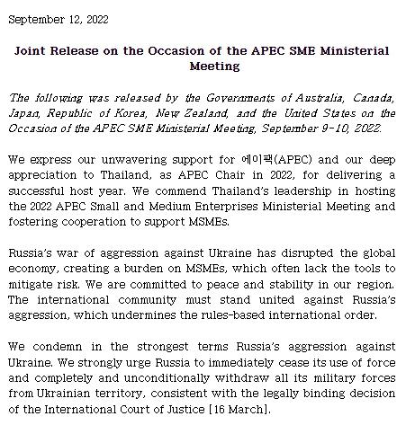 동 보도문은 에이팩(APEC) 중소기업 장관회의 결과물이 아니며, 그동안 에이팩(APEC) 등 각종 국제회의에서 우크라이나 사태 관련 대응을 적극적으로 주도해온 국가들이 주축이 되어 공동의 목소리를 내기 위한 취지로 합의된 것이다.