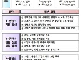 이를 통해 2023년도에 콘텐츠 매출액 약 153조 원(2021년 약 136조 원), 콘텐츠 일자리 약 68만 개(2021년 약 65만 개), 콘텐츠 수출액 약 166억 달러(2021년 약 136억 달러)를 달성할 것으로 기대한다.