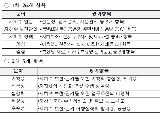 1차 평가는 지하수 일반, 지하수 보전ㆍ관리 등 5개 분야 26개 항목에 대해 지자체가 제출한 서류를 바탕으로 심사했다.