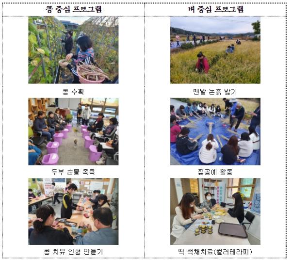 충남 홍성군 오서산상담마을 농장에서는 사회복지사 9명이 콩 중심 치유농업 프로그램을 체험했다. 콩 수확, 두부 순물 족욕, 콩 치유 인형 만들기, 두부 요리 시식을 체험한 참가자들의 평균 스트레스 지수는 참가 전 98.1에서 78.8로 19.3 감소했다. 평균 피로도 역시 90.6에서 78.9로 11.7 감소했다.