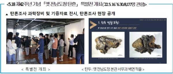 한편, 문체부는 12월 5일(월)부터 2023년 1월 말까지 옛 전남도청 별관과 경찰국 민원실, 상무관, 나무 4그루에 대한 3단계 2차 감마선 조사를 한다. 앞서 문체부는 1단계 기초조사(’20. 7.~’21. 3.)를 통해 의심 탄흔 535개를 확인했고, 2단계 1차 정밀조사(’21. 12.~’22. 7.)에서는 의심 탄흔 265개 대한 조사 분석을 마무리하고 이 중 13개 탄두를 특정했다. 최종 탄흔 조사 결과는 2023년 말에 발표할 예정이다.