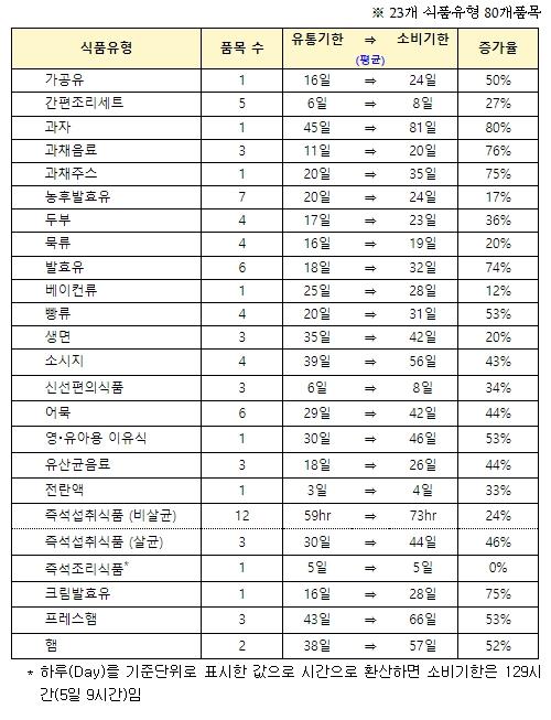 * (주요 품목 평균값) 두부 : (유통기한) 17일→(소비기한) 23일(36%↑), 햄 : (유통기한) 38일→(소비기한) 57일(52%↑), 발효유 : (유통기한) 18일→(소비기한) 32일(74%↑)