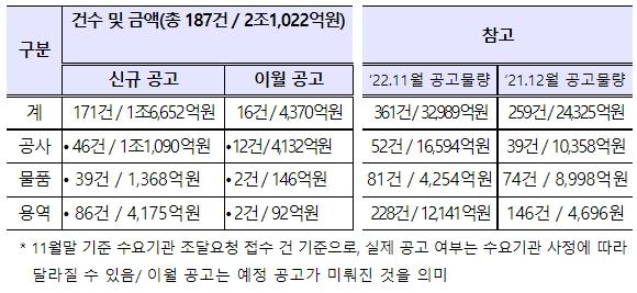 (물품) 금액이 가장 큰 사업으로는 철근 단가계약(2조 7천 991억 원, 4월) 이었으며, 눈길을 끄는 사업으로는 2023~2025학년도 국정도서 발행자 선정(3,241억 원, 9월) 사업, 2022년 신규 비축 보건마스크(KF-94) 구매(138억 원, 9월/11월) 등이 있다.