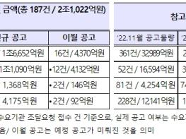 (공사) ‘22년 발주된 대형공사 가운데 생활 밀접성이 높은 사업으로 동부간선 지하화(영동대로) 건설공사(3,639억 원, 8월), 비산포일 통합정수장 현대화사업(1,084억 원, 7월), 국립암센터 본관동 리모델링공사(950억 원, 2월) 등이 주목을 받았다.