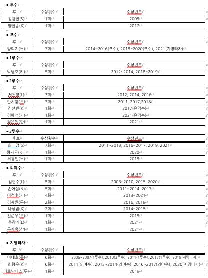 이번 후보에 오른 선수 중 골든글러브 최다 수상자는 최정(SSG)과 양의지(두산)다. 총 7번의 영광을 안았던 두 선수가 올해도 골든글러브를 받게 되면 8번 수상한 한대화(전 쌍방울), 양준혁(전 삼성)과 함께 통산 최다 수상 공동 2위에 오른다. 골든글러브 역대 최다 수상은 이승엽(전 삼성)이 기록한 10번이다.