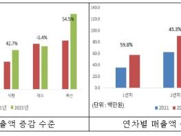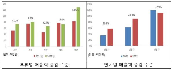 품목별로는 축산(54.5%), 식량(42.7%), 과수(41.1%) 순으로 매출액 변화가 두드러졌다. 또한, 영농경력이 적을수록 매출액 증가 폭이 큰 것으로 나타나 영농 정착 초기에 있는 청년농업인에게 전문적인 경영 상담이 효과적인 것으로 분석됐다.