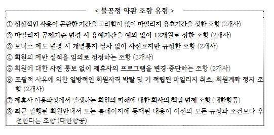 그동안 공정위는 국내 주요 항공사인 대한항공과 아시아나항공 2개사의 항공마일리지 관련약관인 '회원약관' 등을 대상으로 불공정약관 여부에 대한 심사를 진행했으며, 그 결과 8개 조항이 불공정약관에 해당한다고 판단했다.