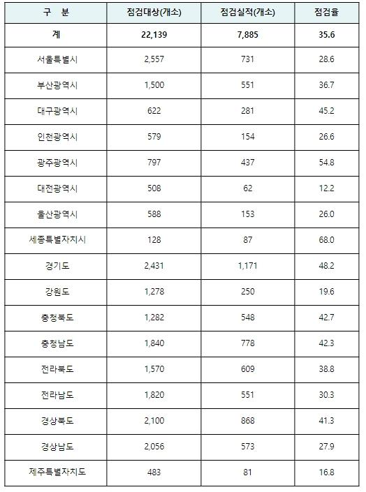 5월 12일까지 민간전문가 등 연인원 20,282명이 점검에 참여하여 점검대상의 약 39.2%인 11,644개소에 대해 점검을 완료했다.