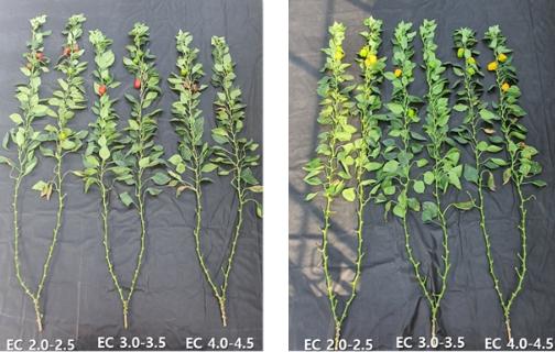 연구진은 농가에서 많이 재배하는 ‘시로코(붉은색)’, ‘볼란테(노란색)’ 2품종을 5월과 6월 펄라이트 배지에 아주심기(정식)하고, 배양액 전기전도도(EC)를 3수준(2.0~2.5, 3.0~3.5, 4.0~4.5)으로 나눠 처리했다.