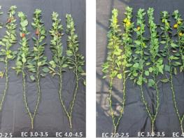 또한, 영양생장기, 열매 커지는 시기(비대기)에는 배양액 농도(전기전도도)를 2.5에서 2.0으로 단계적으로 낮춰 공급하는 것이 유리하다.