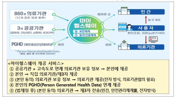 먼저, 올해 하반기에‘건강정보 고속도로’를 본격 추진하여 여러 기관에 흩어진 개인 의료데이터를 본인에게 제공하고, 본인이 원하는 의료기관 등에 자신의 데이터를 전송·활용할 수 있도록 지원한다. 검사, 약물처방 정보 등 12개 항목의 표준화된 의료정보를 제공할 예정이다.