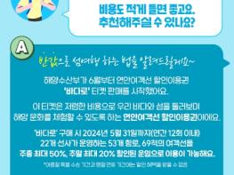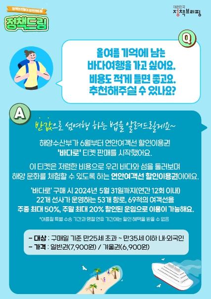 A.?해양수산부가 6월부터 연안여객선 할인이용권 '바다로' 티켓 판매를 시작했어요. 이 티켓은 저렴한 비용으로 우리 바다와 섬을 둘러보며 해양 문화를 체험할 수 있도록 하는 연안여객선 할인이용권이에요.