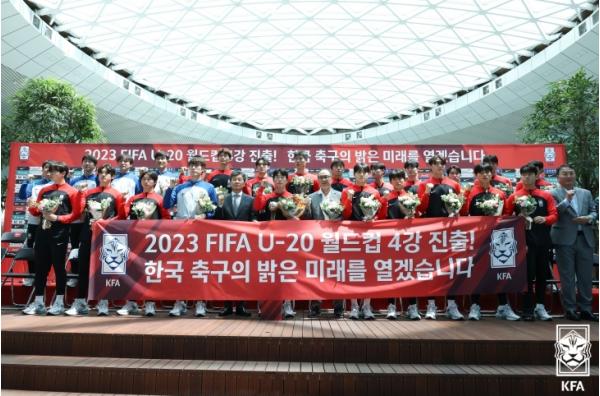 이날 오후 입국한 U-20 대표팀 선수단은 입국장에서 도열 인사 후 인천국제공항 제2교통센터에 위치한 행사장으로 이동했다. 환영행사의 축사를 맡은 정몽규 회장은 “2회 연속 4강 진출은 아시아 최초이고, 세계적으로도 흔한 일이 아니다. 이번 기회를 바탕으로 대한민국 선수들이 국제 무대에서 잘할 수 있다는 것을 증명했다”면서 “여러분들이 대회에서 보여준 기량을 소속팀에서도 마음껏 보여주길 바란다. 또 조만간 국가대표팀에서 다시 만나길 기대한다”는 인사를 건넸다.