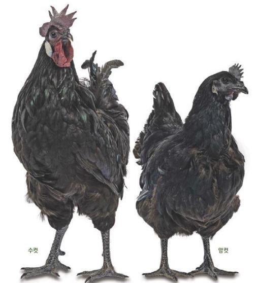 연구진은 검은색의 ‘오계’와 피부색이 서로 반대인 ‘백색레그혼’을 교배해 2세대에 걸쳐 참조집단을 조성했다.