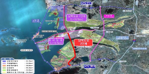새만금 핵심 광역교통망의 가로축인 동서도로는 신항만~복합개발용지~새만금-전주 고속도로를 연결해 주고 세로축인 남북도로는 새만금 내부 산업연구용지~복합개발용지~관광레저용지와 군산?부안 등 주변도시를 연결해 주는 간선도로이다.