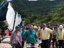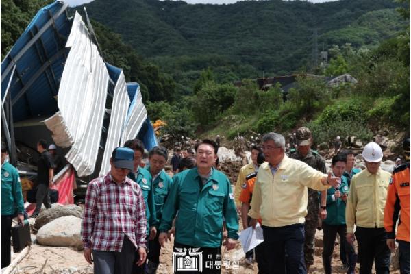 [중앙방송, 이선호기자] 윤석열 대통령은 7월 17일 집중호우로 피해를 입은 경북 예천군 산사태 피해 현장을 찾아 현장 상황을 점검하고 이재민들을 위로했다.