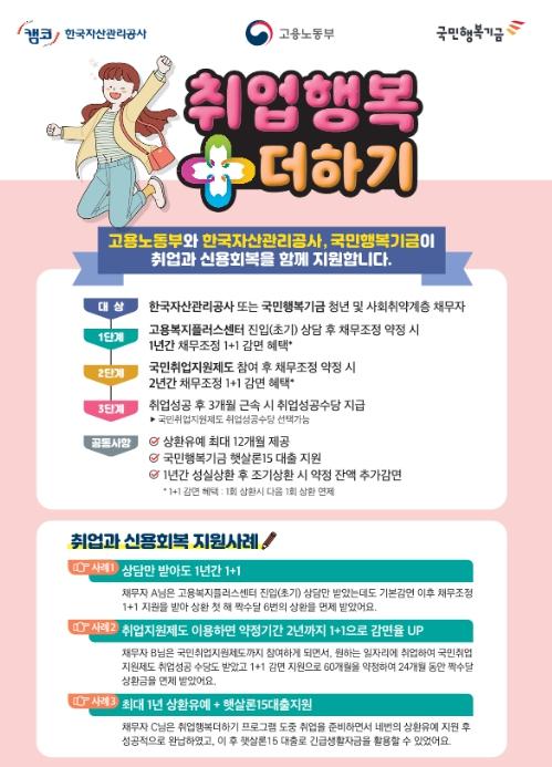 고용부 등 3개 기관은 ?취업행복 더하기 채무조정? 제도를 마련하고, 청년·취약계층 금융 채무자가 고용노동부의 고용복지 센터 초기상담 및 국민취업지원제도의 취업 서비스에 참여 시 신용회복을 위한 추가 채무감면 및 취업지원성공지원금 등 각종 금융 인센티브를 받을 수 있도록 지원한다.