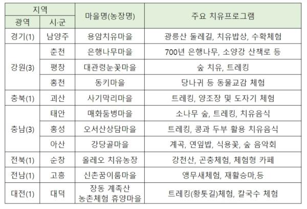 다양한 자원을 활용한 치유프로그램을 도입하여 시범적으로 운영하고 있는 마을로 마을 내 치유서비스 연계성, 이름 계절성, 프로그램 안전 및 안전성, 숙박 및 음식 서비스 등을 고려한 11개소를 소개합니다!