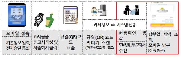기존에 입국 여행자가 ?여행자 세관신고? 앱(App)을 통해 과세물품을 신고하더라도 별도의 ‘세관 검사대’에서 ‘종이 납부고지서’를 발급받은 후 세금을 납부해야 했던 불편을 줄이기 위해, 8월 1일부터 입국 여행자가 모바일 앱(App)을 통해 과세물품을 신고한 경우, 앱(App)에서 생성된 큐알(QR)코드를 공항·항만 입국 시 표시된 ‘세관 신고 있음(Goods to declare)’ 통로에 있는 QR코드 리더기에 인식시키면 모바일로 ‘전자 납부고지서’를 전송받아 앱(App)을 통해 세금을 납부할 수 있게 된다.