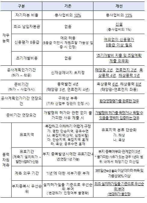 이에, 산업부는 재무능력을 중심으로 발전사업 허가기준을 강화하는 한편, 사업 기간 연장요건을 강화하여 허가된 사업이 적기에 이행되도록 촉구한다는 방침이다. 현재 발전허가 이후 일정 기한 내 발전소를 가동하지 않으면 해당 사업허가를 취소하도록 규정되어 있다. 현재까지는 의례적으로 기한 연장을 허용해왔지만, 이번 조치로 일정 절차를 진행하지 않을 경우에는 더 이상 연장이 불가능하게 바뀌는 것이다.