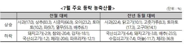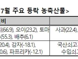 [중앙방송, 손미정기자] 농림축산식품부는 집중호우에도 불구하고 7월 농축산물 소비자물가지수가 전년 동월 대비 1.5% 하락하였다고 밝혔다. 상추 등 강세를 보이던 채소류 가격이 점차 안정을 보이고 있고, 다른 농축산물의 수급 여건도 전반적으로 양호하여 8월에도 소비자물가 안정세를 유지할 전망이다.