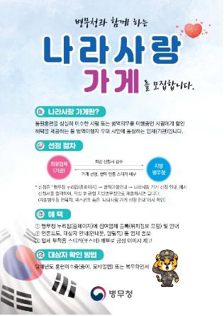 병무청은 나라사랑 가게 참여 활성화와 홍보를 위해 선정된 업체를 병무청 누리집(홈페이지)에 등록·관리하고, 나라사랑 가게 인증 포스터를 사업장에 부착할 계획이다.