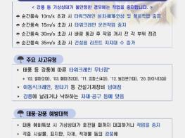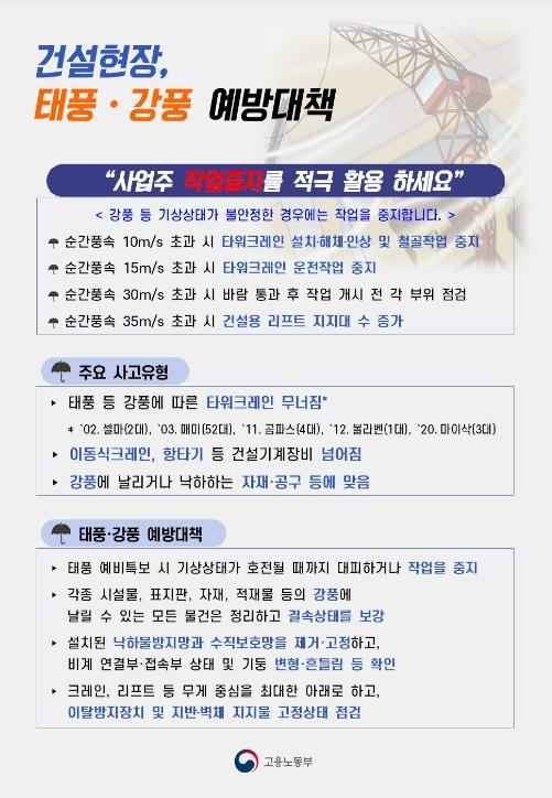 고용노동부는 태풍으로 인한 급박한 위험이 있는 경우 사업주 작업중지를 적극 실시해야 하고, ?자재?적재물?표지판?공구 등의 강풍 피해(무너짐, 날림 등), ?타워크레인?항타기 등 대형장비 전도, ?굴착면?지하층 침수, ?경사면?옹벽 등의 붕괴(산사태 등), ?침수에 의한 감전 등에 대한 안전조치를 해야 한다고 당부했다.