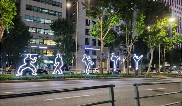 ‘테헤란로 일대 태권도 상징물 조성사업’도 최근 완공됐다. 이곳은 테헤란로 156길, 국기원 입구 사거리 일대 중앙녹지대다. 설치된 조형물은 태권도 동작을 담은 상징물 11개로 국기원과 협의, 설치 위치, 동작 등을 추천 받았다. 조형물은 2.9m~4.2m로 역동적인 품새 동작 등을 형상화 한 것이 특징이다. 또 국기원 사거리를 중심으로 역삼역 방향에 설치된 5개의 조형물은 태권도 기술인 ‘돌개차기’의 연속 동작으로 역동성이 눈에 그려진다. 국기원사거리와 강남역 방향으로 3개씩 설치된 6개는 ‘발차기’와 ‘막기’ 자세를 형상화 했다. 특히 저녁시간에는 조명까지 들어와 테헤란로의 명물이 될 것으로 전망된다. 예산은 총 4억 3,000여 만원.