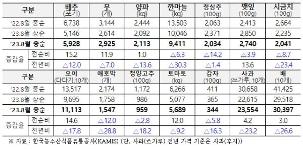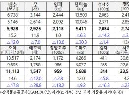 먼저 배추?무의 경우, 현재 작황이 양호하고 봄철 저장물량도 여유가 있어 8월 중순 가격은 전년보다 낮게 형성(배추 12.0%↓, 무 7.0%↓)되고 있다. 다만, 8월 상순 대비 10% 남짓 상승했는데 이는 배추?무의 계절적 특성으로 8~9월은 가격이 연중 가장 높게 형성되는 시기이기 때문이다. 앞으로 고온?태풍 등 기상 악화로 인한 병해 등 발생이 높은 변수로 작용할 전망이다. 수급 불안 시 농식품부는 비축물량(8월 16일 현재 배추 5.8천 톤(전년비 107.1%↑), 무 2.5천 톤(전년비 212.5%↑)) 및 계약출하 물량(8월 16일 현재 배추 39천 톤, 무 42천 톤) 등을 활용하여 대응할 계획이다.