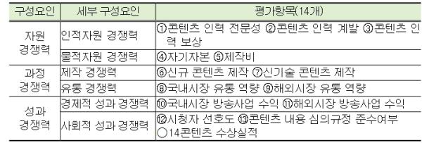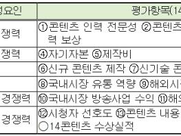 동 평가는 실시간 텔레비전 방송을 위해 등록한 방송채널사용사업자가 운영하는 채널 중 전년도 방송실적분이 10개월 이상인 채널을 대상으로 △자원 경쟁력 △과정 경쟁력 △성과 경쟁력 3개 분야에 총 14개 세부 항목으로 평가할 계획이다. 특히, 이번에는 콘텐츠 제작비용 평가 시 사업자의 방송사업 규모가 반영될 수 있도록 ‘제작비’항목을 개선했다.
