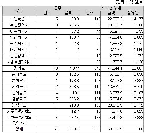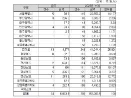 지역별로는 경기도 4,377억 원, 전라북도 624억 원, 경상북도 326억 원, 그 밖의 지역이 1,556억 원이다.