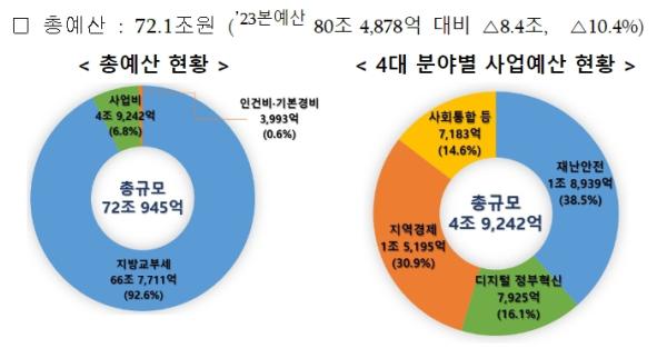 [중앙방송, 박정원기자] 행정안전부는 주요 사업비 규모가 2023년(4조 8,145억원) 대비 1,097억원(↑2.3%) 늘어난 4조 9,242억원을 2024년도 예산안으로 편성했다.