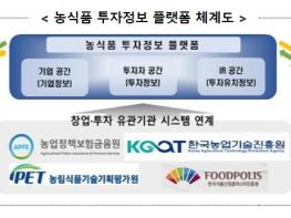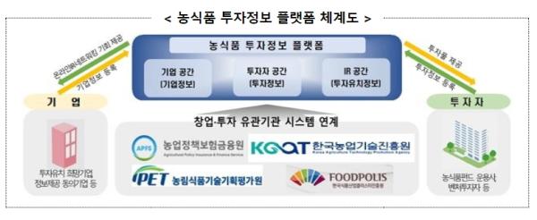 이를 개선하기 위해 농식품부는 지난 6월 발표한 ?농식품분야 민간투자 활성화 방안?의 일환으로, 농업정책보험금융원 등 농식품분야 창업?투자 유관기관과 협업하여 ‘농식품 투자정보 공유 플랫폼’을 구축하고 운영한다.