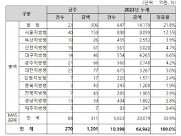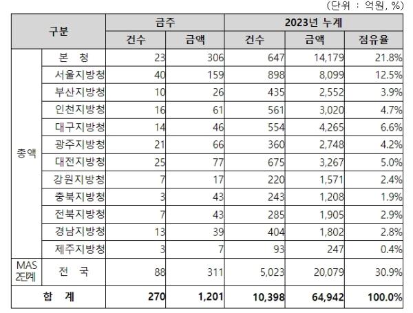 지역별 발주량을 보면, 총액계약 대상 890억 원 중 본청이 306억 원으로 34.4%를 집행하고 서울청 등 11개 지방청에서 584억 원을 각각 집행할 예정이다.