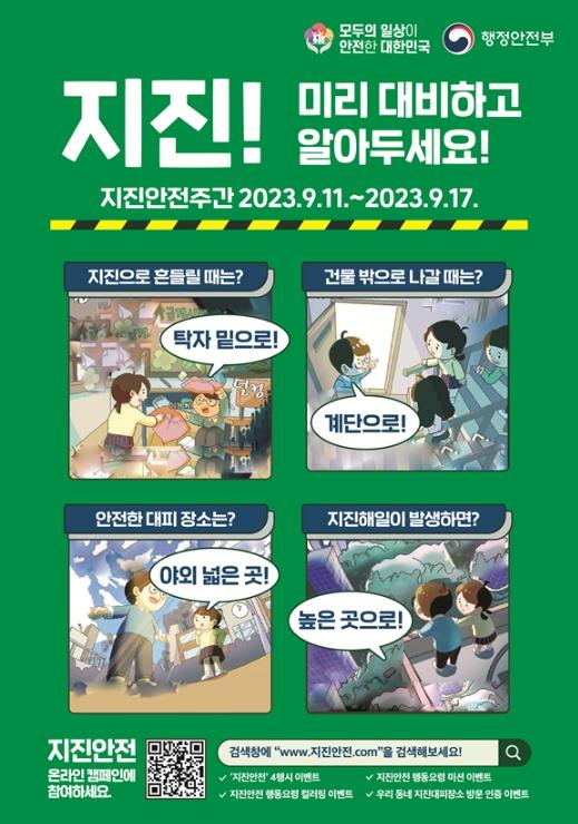 특히 행정안전부는 국민이 한 곳에서 다양한 지진안전 정보를 접할 수 있도록 ‘지진안전 누리집’을 통해 온라인 캠페인을 진행하고, 국민 관심과 참여 확대를 위한 이벤트도 진행한다.