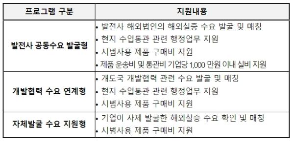 이번 공모는 폭넓은 해외실증 기회 제공을 위해 발전 5개사, 국제협력단(KOICA), 조달연구원 3개 기관과 손잡고 ①발전사 공동수요 발굴형, ②개발협력 수요 연계형, ③자체발굴 수요 지원형 3개 프로그램으로 구분하여 진행하며, 참가 희망기업은 1개 프로그램을 선택하여 신청할 수 있다.
