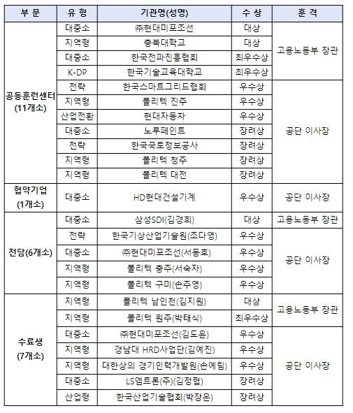 2022년도 성과평가 우수기관은 삼성중공업, 한국국토정보공사 등 58개 기관이 선정됐다. 사업 우수사례는 공동훈련센터, 협약기업, 전담자, 훈련 수료생 등 총 4개 부문에서 25개 기업 시상이 진행된다. 현대미포조선, 충북대학교(이상 공동훈련센터 부문), 삼성SDI 김경희 프로(전담자 부문), 한국폴리텍대학 남인천 캠퍼스 김지원 씨(훈련 수료생 부문)가 대상으로 선정돼 고용노동부 장관상을 받는다.