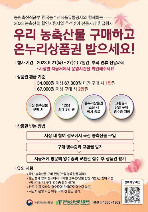 [중앙방송, 박정원기자] 농림축산식품부, 해양수산부와 중소벤처기업부는 농축수산물 소비자 물가 안정을 위해 9월 21일부터 9월 27일까지 ?추석맞이 전통시장 온누리상품권 현장 환급행사?를 공동 개최한다.